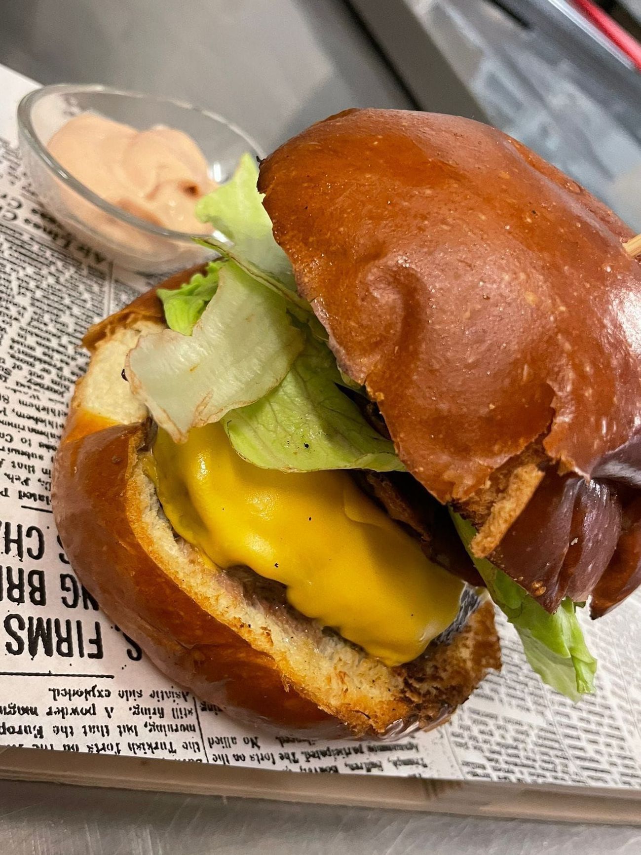 Pan pizza, doppia cotoletta di pollo, scamorza alla piastra, lattuga, maionese, pomodoro, servito con patate.