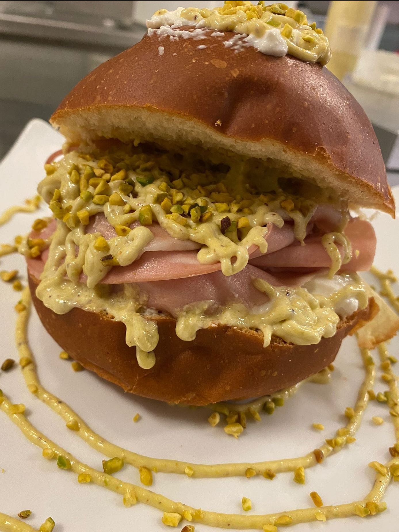 Pan pizza, stracciatella, mortadella, crema di pistacchio, granella di pistacchio.
